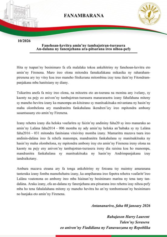 Je ne peux pas lire ce communiqué des nouvelles zautiriteés car il est gasy et je n ai que quelques notions apprises phonétiquement et vody et cie j ai honte de mon malagasy hihihi ..bref sérieusement ceci dit c est un signe quand on utilise une langue que seuls les autotochnes pigent...la royauté puis les jacobins kif-kif ont pas interdit les langues régionales dont la plus ancienne utilisée par les régions toujours françaises historiquement l occitan BREF ou j’y connais rien ou les vovo zautiriteés sont pas prêtes à renverser la table et qu elles ( vaovao régime) avertissent les jeunes de la gen Z je pense principalement les vieux ( nés avant 90) etant des pleutres de chez pleutres à moins ce soit la cupidité ou des deux je finis ce post en rappelant que des mi 2000 sur wanadoo je demandais le nom du ministre de ratsiraka pour lequel sa sœur achète de cachan une double pompe au n1 mondial de l orpaillage...et que personne n osait donner le nom ce ministre du sud dont j ai même la date excate du dédouanement ce matis à tamatave en juin 99 mais c était juste pour tester ce ministre j ai rien contre lui m a rien fait je sais bien que dans son genre c est aussi une victime voui fin de semaine prochaine je me porte partie civile au tribunal de Paris concernant ma plainte ( visible sur x poumarat 13000 ) contre le tribunal de Paris l ambassade malgache et la police française..( pas malagasy hihihi)