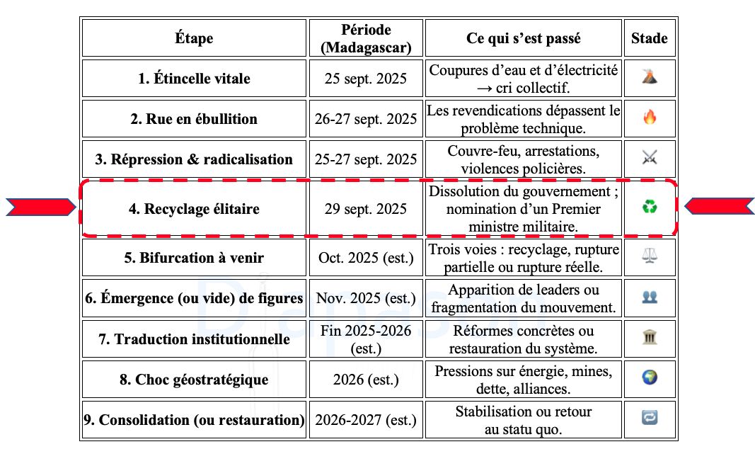 L’année 1972 hante la mémoire nationale. Une jeunesse étudiante galvanisée, des cortèges massifs, une répression meurtrière, puis la chute de l’ordre ancien. Le président Tsiranana cède, le général Ramanantsoa prend la main, un référendum entérine une transition et ouvre la voie à une nouvelle République. Pourtant le système profond ne bascule pas. Les centres de pouvoir se recomposent, l’État se recentre autour d’un appareil qui parle de révolution et de modernisation sans déplacer les rapports de force au cœur de la société. C’est le paradoxe des victoires spectaculaires qui n’accouchent pas d’une refondation. Le parallèle avec la séquence actuelle n’est pas un effet de style. La dynamique de rue a fissuré la façade, l’institution militaire a refermé la porte et a repris l’agenda. Si la jeunesse ne s’engage pas en profondeur dans la politique réelle, si elle ne transforme pas son énergie morale en capacité d’alliance, de procédure et d’exécution, alors ce moment deviendra un sursaut de plus dans la chronologie malgache. Un temps fort, puis un reflux. Le pays a déjà connu ces vagues. En 1972, en 1991, en 2002, en 2009, chaque crise a renversé des hommes sans déplacer durablement l’architecture du pouvoir. Depuis le premier jour du mouvement de la Génération Z, les étapes étaient lisibles comme un crescendo. L’alerte sociale autour de l’eau et de l’électricité. La massification des cortèges. La répression qui transforme la revendication en cause morale. La délégitimation accélérée du pouvoir. L’entrée des appareils. La bascule d’unités d’élite. La recherche d’une issue par le haut. La nomination qui rassure l’ordre plus qu’elle ne répond à la demande. Enfin la normalisation sans réforme. Ce script n’est pas une fatalité. Il indique le prix à payer pour sortir du cycle. Passer du cri à la fabrique des règles. Apprendre la grammaire du pouvoir. Sinon, 1972 restera le miroir de 2025.
